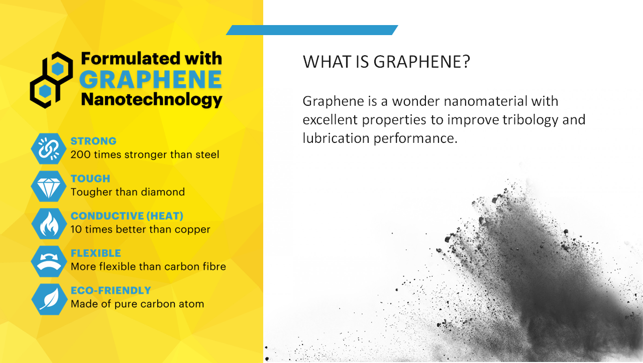 - Graphene, as a lubricating additive, can reduce the coefficient of friction due to its capability to produce a nano-bearing protective layer for the moving parts of your engine.